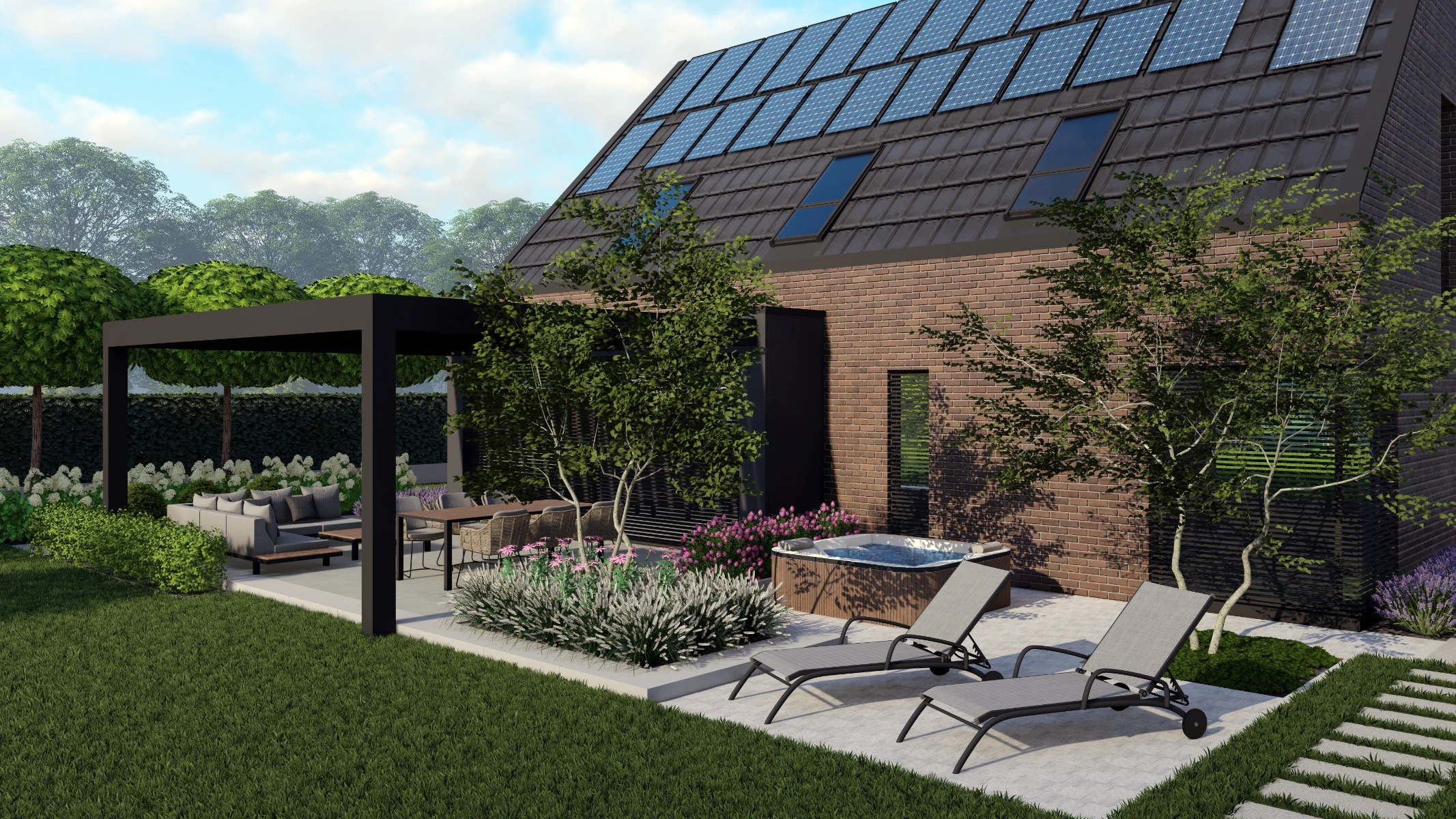 Na obrzeżach miasta w spokojnej okolicy, powstał ogród szyty na miarę i potrzeby jego właścicieli. Został podzielony na strefy: wejściową, wypoczynkową, rekreacyjną oraz gospodarczą. Na niewielkiej przestrzeni udało się fajnie wkomponować duży taras, warzywnik, strefę z hamakami, dodatkowe miejsce do zaparkowania, drzewa i krzewy owocowe, budynek gospodarczy. Taras został zaprojektowany z podziałem na dwie strefy: zadaszoną część wypoczynkową oraz część rekreacyjną z jakuzzi i leżakami. Obie strefy zostały w delikatny sposób wydzielone zielenią, która ma nie tylko funkcje estetyczne, ale również wpływa na nasze zmysły zapachem oraz dźwiękiem – szum traw.